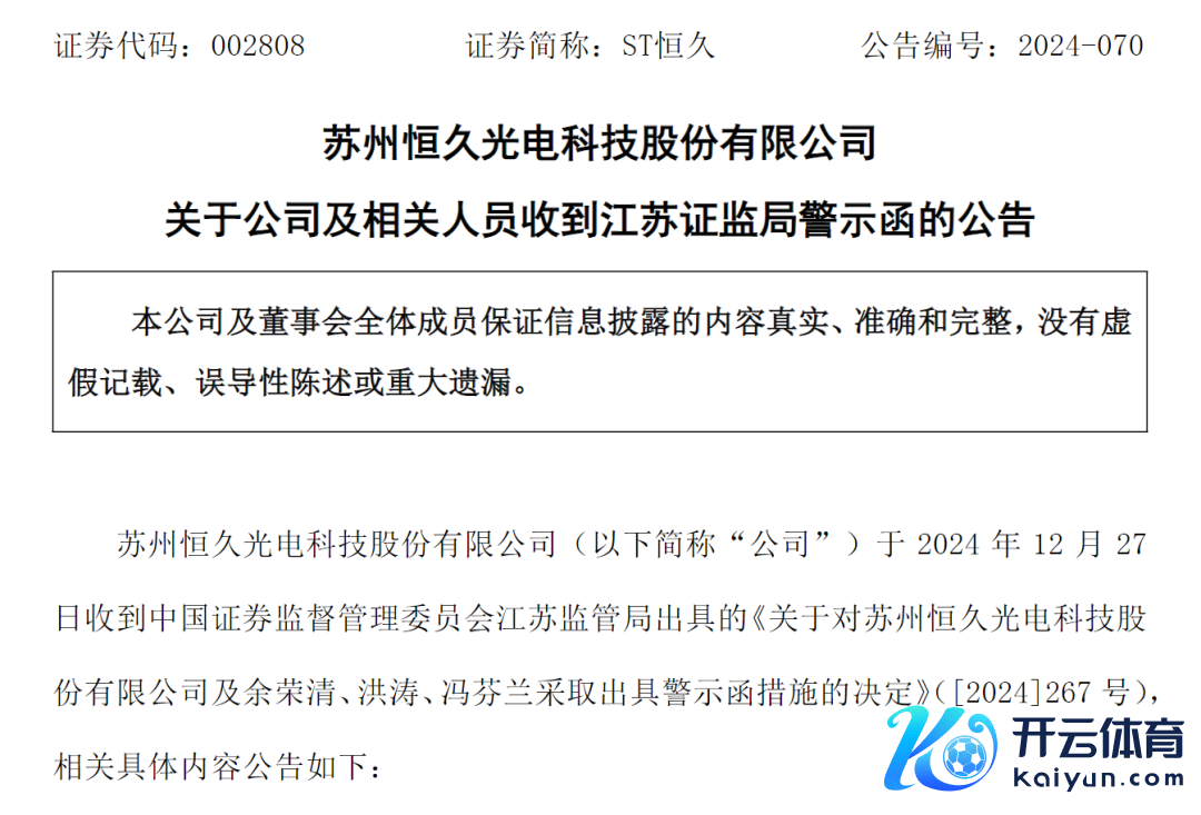 同在12月29日晚,ST永远还公告,公司及关系东谈主员还收到了江苏证监局的警示函,触及问题包括:一、未就对外财务资助事项实时实际信息泄漏和监督贬责义务;二、光导饱读外售业务里面限度存在缺欠;三、里面交游中存货关系财务核算不轨范;四、关联交游未泄漏。