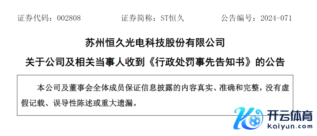 12月29日,ST永远(002808)公告,2024年12月27日,公司及关系牵累东谈主收到江苏证监局《行政处罚事前陈述书》。