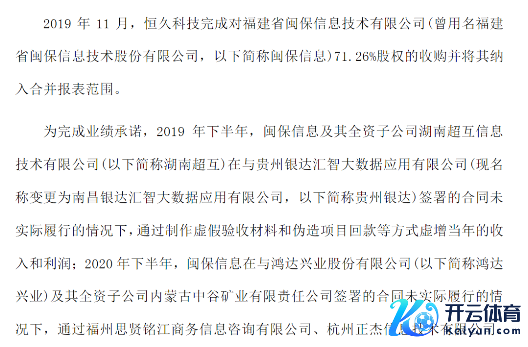 经查明,为完成事迹同意,2019年下半年,闽保信息偏激全资子公司湖南超互信息技艺有限公司(以下简称湖南超互)在与贵州银达汇智大数据应用有限公司(现称号变更为南昌银达汇智大数据应用有限公司,以下简称贵州银达)签署的协议未骨子实际的情况下,通过制作失实验收材料和伪造神色回款等形貌虚增过去的收入和利润。