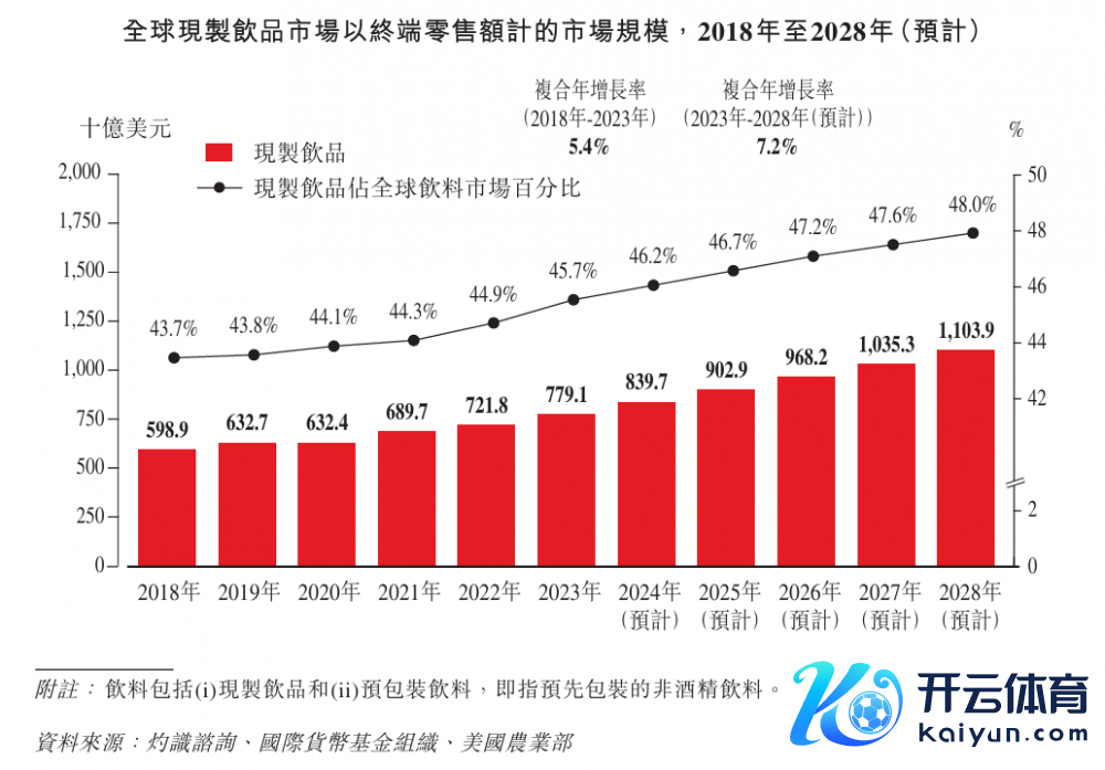 而愈加广泛的全球茶饮市集仍是一派蓝海,恭候勇敢者的探索。据灼识商酌、国际货币基金组织、好意思国农业部等数据统计表露,以末端零卖额计,全球现制饮品市集规模从2018年的5,989亿好意思元增长至2023年的7,791亿好意思元,复合年增长率为5.4%。2023年至2028年的复合年增长率预测将进一步提高至7.2%,带动市集规模增长至2028年的11,039亿好意思元,占据全球饮料市集近一半份额。